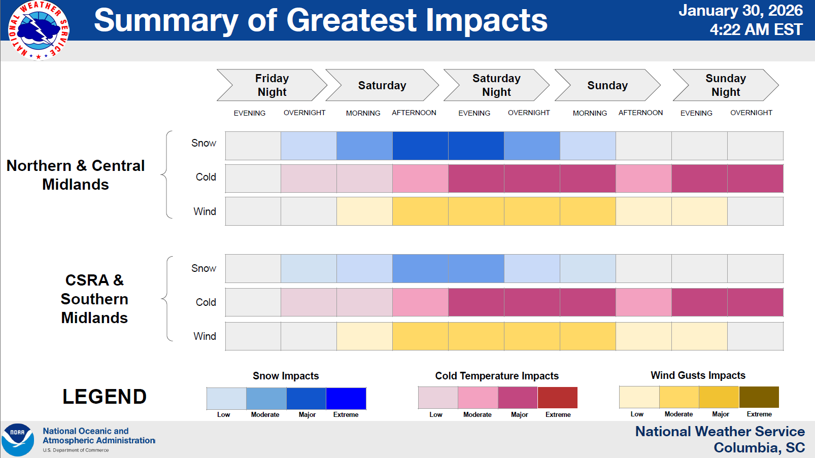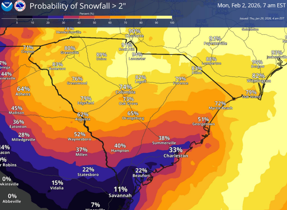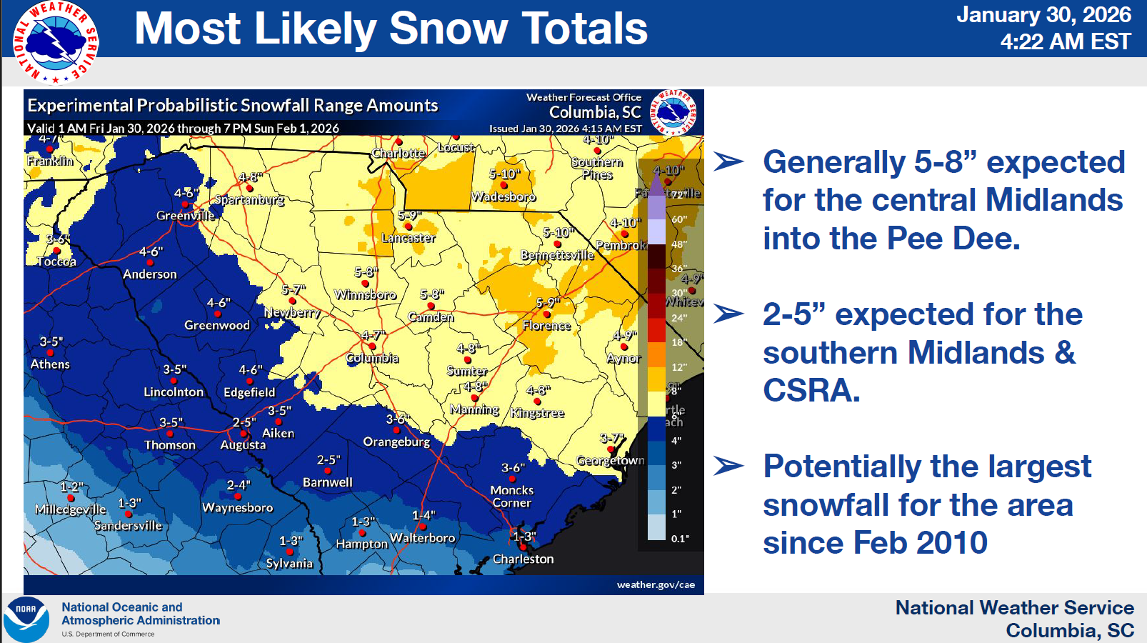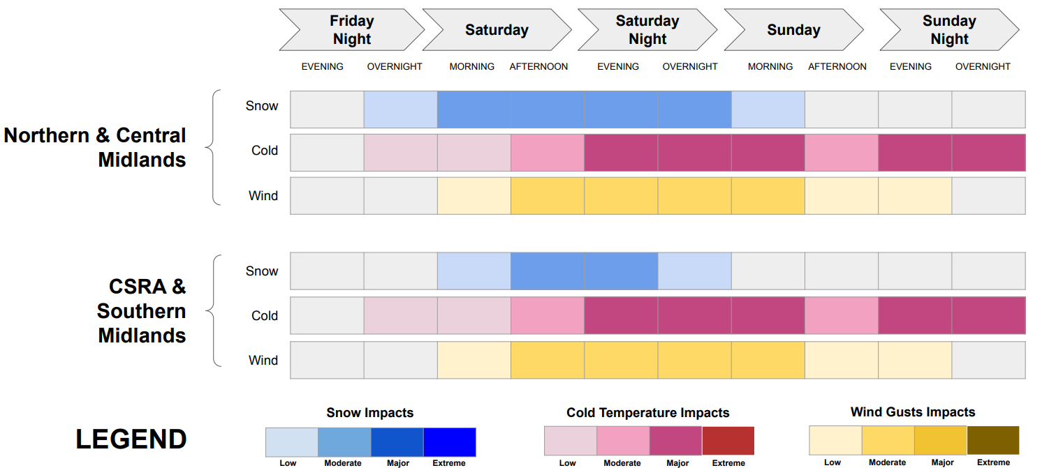 The National Weather Service - Columbia (NWS CAE) has issued a Winter Storm Warning for the Midlands region. Snow is anticipated to begin to fall after in the early morning hours Saturday and will continue throughout the day into Sunday morning. The NWS CAE predicts that the Central to Northern Midlands will receive approximately 5” to 8” of snow, whereas the Southern Midlands will receive 2” to 5”.